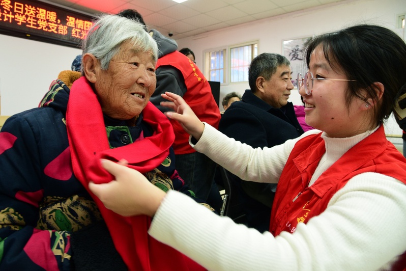 图为学生党员志愿者为老人围围巾 石玉成 供图