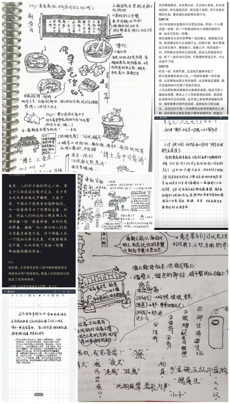 郭艳同学的《献给阿尔吉侬的花束》读书笔记中写到:“无论是从幽冥走进光明的灵魂,还是从光明世界回到黑暗洞穴的人,都经历了蜕变,成长为现在的样子”。高天奇同学阅读《翦商》后这样感悟:“也许,我们至今也还难以完全了解我们自己。考古,犹如一面深埋地下的镜子,倒映出我们陌生的形象。已有之事,后必再有;已行之事,后必再行;阳光之下,并无新事”。雷亮同学更是为《唐朝穿越指南——长安及各地人民生活手册》制作了精美的手抄报。