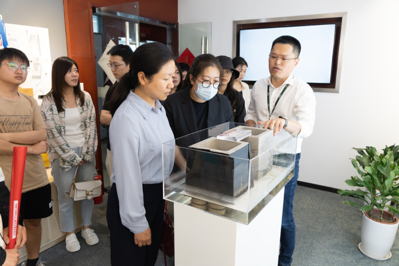 在佳固士新材料有限公司,同学们了解到企业产品的技术演进、现实应用与未来前景。作为中国“自愈合防水”的领先者,其渗透未反应的材料遇水再次反应、自动愈合裂纹,给同学们留下了深刻印象。