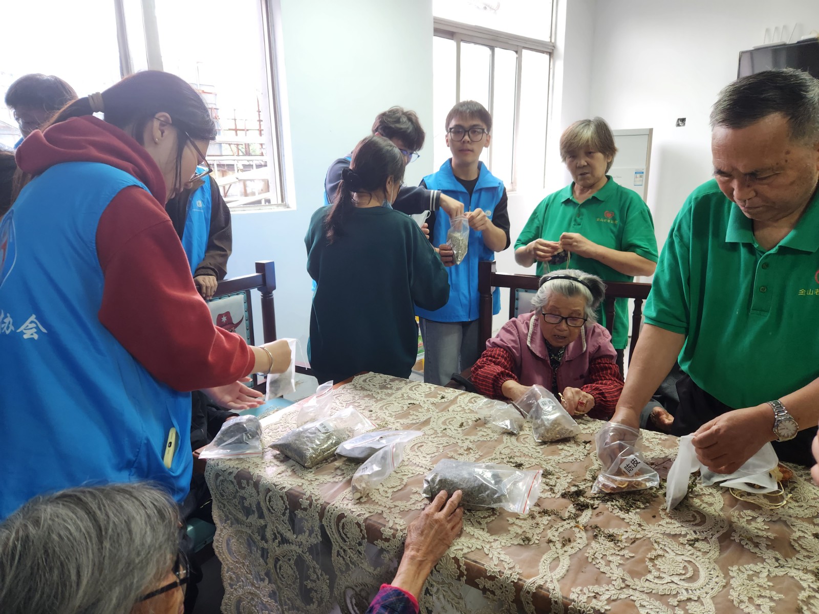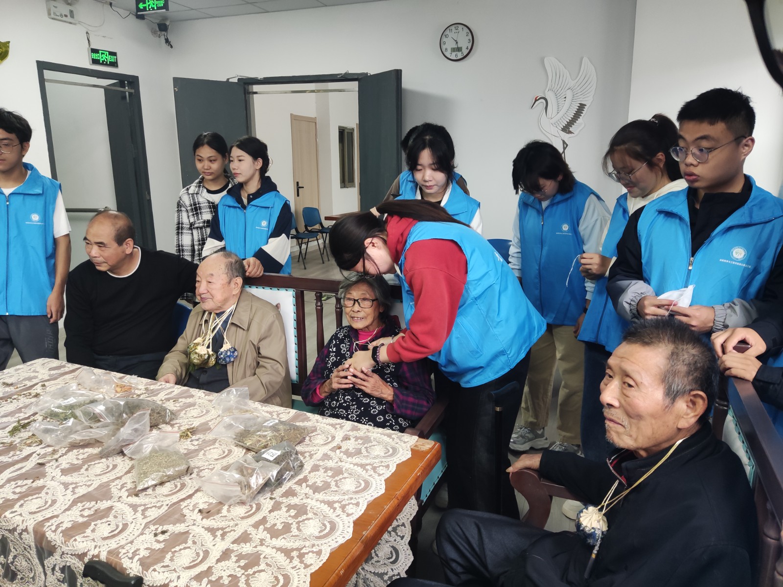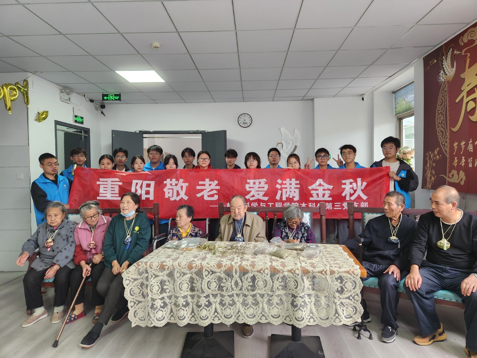 孝亲敬老,这一流淌在华夏儿女血脉中的传统美德,不仅是中华民族的精神瑰宝,更是每一位大学生肩上沉甸甸的责任与使命,需要我们用心去继承,用行动去坚守。为此,10月13日,“蒲公英”义工站和本科生第三党支部带领同学们前往金山老年公寓,与那里的长辈们共度重阳佳节。同学们不仅与老人们一同动手,精心制作香囊,还准备了唱歌、诗朗诵等丰富多彩的节目,为老人们带去欢乐与惊喜。现场洋溢着温馨与融洽的氛围,老人们的脸上也都洋溢着幸福的笑容。